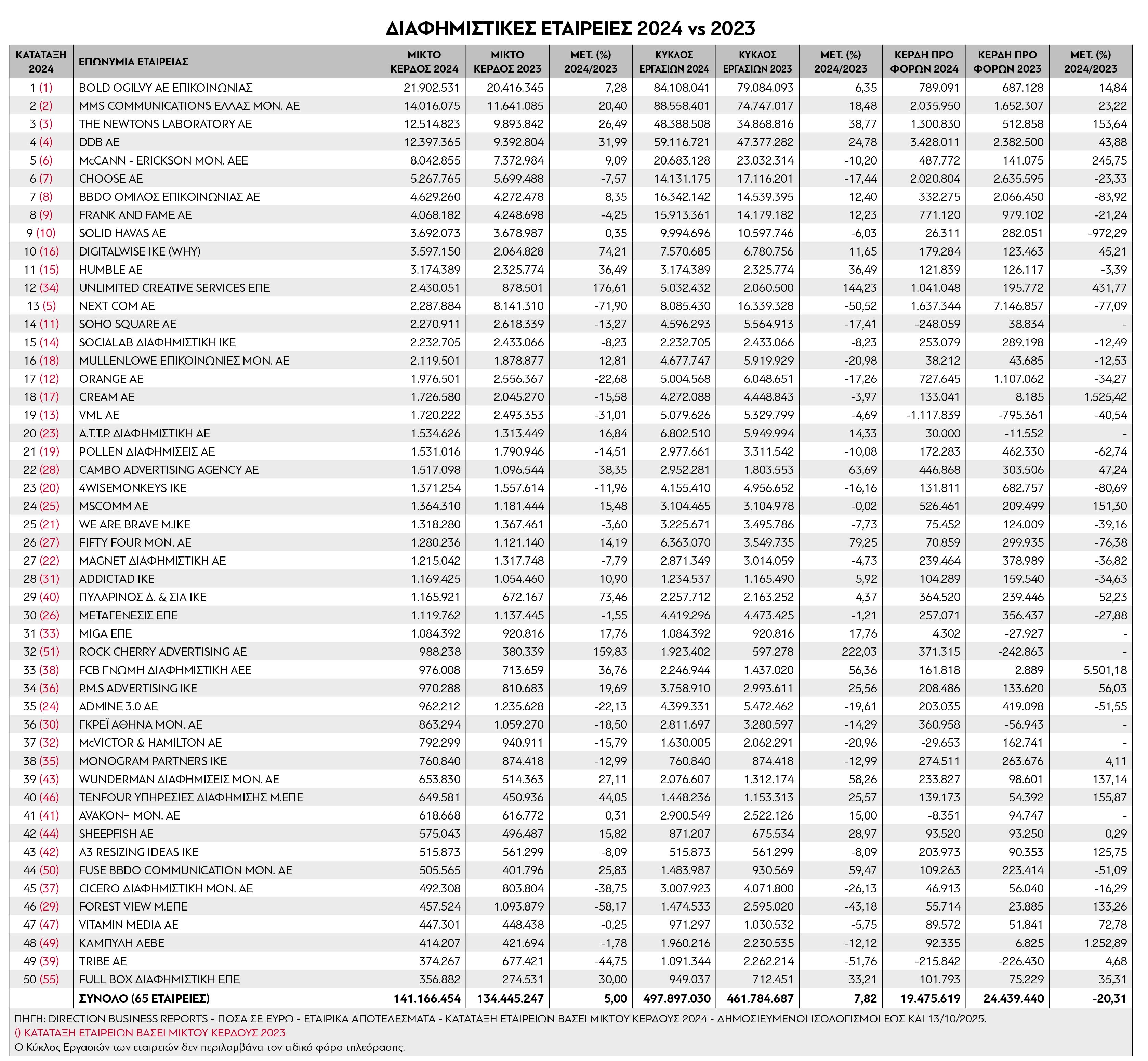 Στην κατάταξη µε βάση τα µικτά αποτελέσµατα του 2024, την πρώτη πεντάδα (µε σειρά εµφάνισης) αποτελούν οι Bold Ogilvy (21,9 εκατ. ευρώ και ανάπτυξη +7,28%), MMS Communications Ελλάς - Publicis (14 εκατ. ευρώ και ανάπτυξη +20,4%), The Newtons Laboratory A.E. (12,51 εκατ. ευρώ και ανάπτυξη +26,49%), DDB A.E. (12,39 εκατ. ευρώ και αύξηση +31,99%) και McCann Erickson A.E. (8 εκατ. ευρώ και άνοδος 9,09%). Το top 10 συµπληρώνουν (πάντα µε σειρά κατάταξης) οι Choose (5,26 εκατ. ευρώ αλλά υποχώρηση -7,57%), ΒΒDO (4,62 εκατ. ευρώ και άνοδος 8,35%), Frank and Fame (4 εκατ. ευρώ και υποχώρηση -4,25%), Solid Havas (3,69 εκατ. ευρώ µε άνοδο 0,35%) και η DigitalWise - WHY (3,59 εκατ. ευρώ και άνοδος +74,21%) .jpg)