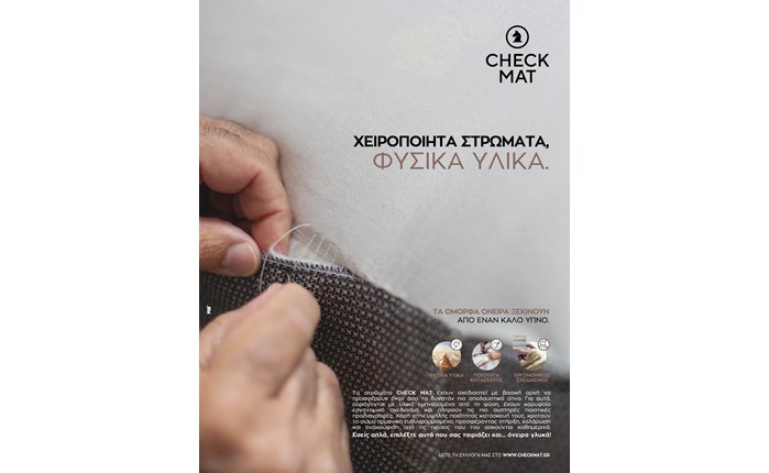 Με στόχο να αναδείξει τη χειροποίητη μέθοδο παραγωγής τους και τα φυσικά υλικά από τα οποία κατασκευάζονται τα στρώματα Check Mat, η Α3® σχεδίασε καμπάνια καταχωρίσεων και προωθητική ενέργεια που υλοποιήθηκε σε συνεργασία με τον ραδιοφωνικό σταθμό Pepper 96.6.