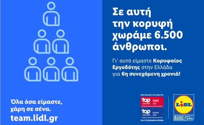 Για 6η συνεχόμενη χρονιά, η Lidl Ελλάς βραβεύτηκε από τον διεθνώς αναγνωρισμένο οργανισμό Top Employers Institute με τον τίτλο του Κορυφαίου Εργοδότη σε Ελλάδα και Ευρώπη, για τον προσανατολισμό και τις δράσεις της με επίκεντρο τους εργαζομένους της.