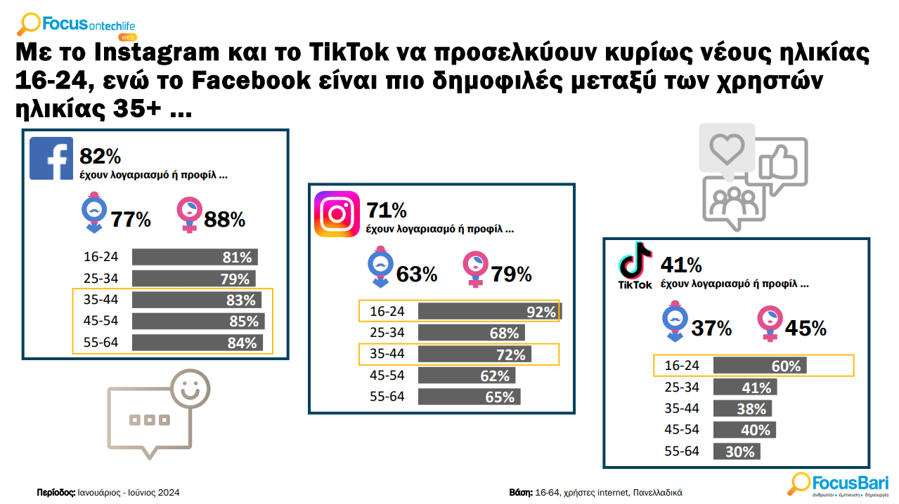 - TikTok και Instagram σε απόλυτη κυριαρχία στους νέους ηλικίας 16-24, ενώ το Facebook παραμένει πιο δημοφιλές στις ηλικίες 35+.