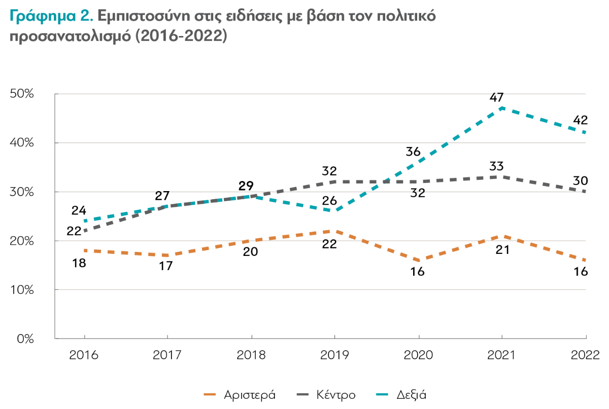 Κοιτάζοντας την εμπιστοσύνη στις ειδήσεις διαχρονικά από το 2016 που διεξάγεται η έρευνα στην Ελλάδα, με γνώμονα και τον πολιτικό προσανατολισμό των ερωτηθέντων, βλέπουμε πως τα τελευταία χρόνια η πολιτική πόλωση έχει επηρεάσει και τη σχέση των πολιτών με τα ΜΜΕ. Για τις ανάγκες αυτού του γραφήματος, χωρίσαμε τους ερωτηθέντες σε "αριστερούς", "κεντρώους" και "δεξιούς" με βάση το πώς τοποθετούν τον εαυτό τους στον πολιτικό άξονα. Αν και ήδη από το 2016 υπήρχαν χαμηλά επίπεδα εμπιστοσύνης στις ειδήσεις και από τις τρεις ομάδες, το 2022 βλέπουμε μεγαλύτερες διαφορές. Πιο συγκεκριμένα, ενώ ανάμεσα στους "αριστερούς" ερωτηθέντες υπήρχε μια μικρή πτώση (από 18% σε 16%) παρατηρούμε άνοδο της εμπιστοσύνης στους "κεντρώους" (από 22% στο 30%) και στους "δεξιούς" ερωτηθέντες (από 24% σε 42%). Έτσι οι 6 ποσοστιαίες μονάδες εμπιστοσύνης που χώριζαν αριστερούς και δεξιούς ερωτηθέντες το 2016 έγιναν 26 το 2022, αντανακλώντας την πολιτική αντιπαράθεση γύρω από τα ΜΜΕ μεταξύ κυβέρνησης και αντιπολίτευσης τα τελευταία χρόνια.