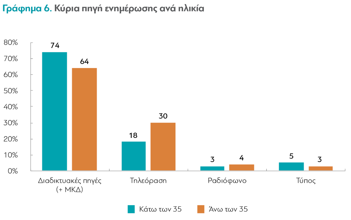 Οι διαφορετικές ενημερωτικές συνήθειες με βάση την ηλικία είναι διακριτές όταν εξετάζουμε ποια είναι η κύρια πηγή ενημέρωσης των ερωτηθέντων διαφορετικών ηλικιών (είτε στο διαδίκτυο είτε εκτός διαδικτύου) (Γράφημα 6). Οι ηλικίας κάτω των 35 επιλέγουν διαδικτυακές πηγές (74%) σε μεγαλύτερο βαθμό από τους ερωτηθέντες άνω των 35 (64%). Την "τηλεόραση" επιλέγει ως κύρια πηγή ενημέρωσης το 30% των άνω των 35 και μόλις το 18% των κάτω των 35, ενώ πολύ μικρά ποσοστά επιλέγουν το ραδιόφωνο και τον Τύπο ως την κύρια πηγή ενημέρωσής τους, ανεξαρτήτως ηλικίας. Εδώ είναι σημαντικό να αναφέρουμε πως οι ηλικιακές διαφορές στην επιλογή διαδικτυακών πηγών και τηλεόρασης θα ήταν ακόμα μεγαλύτερες αν είχαμε συμπεριλάβει και το ποσοστό των Ελλήνων που δεν έχουν σύνδεση στο διαδίκτυο, οι οποίοι είναι κατά κανόνα μεγαλύτερης ηλικίας.