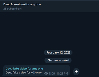 Υπάρχουν εκατοντάδες κανάλια (περίπου 400-500) και ομάδες στο Telegram που προσφέρουν ποικίλες υπηρεσίες deepfake, από αυτοματοποιημένα bots που καθοδηγούν τους χρήστες σε ολόκληρη τη διαδικασία έως εξατομικευμένες υπηρεσίες που παρέχονται απευθείας από μεμονωμένους εγκληματίες στον κυβερνοχώρο. Οι τιμές ξεκινούν από 2 $ ανά βίντεο και για 100 $ μπορείτε να πληρώσετε για περισσότερα βίντεο και προσπάθειες. Η δημιουργία δόλιου περιεχομένου είναι τόσο ανησυχητικά προσιτή.