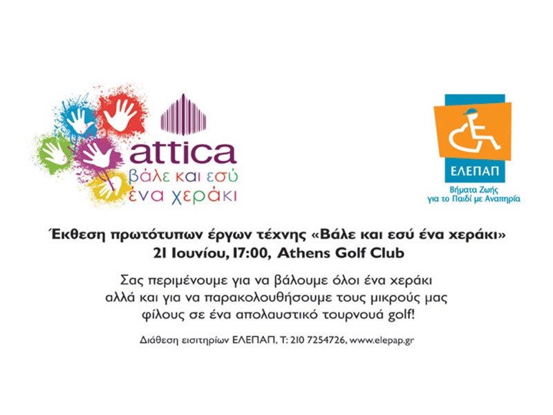 Εκδήλωση του attica για την ΕΛΕΠΑΠΗ εκδήλωση θα πραγματοποιηθεί την Τρίτη 21 Ιουνίου στο Athens Golf Club. Με στόχο τη στήριξη του έργου της ΕΛΕΠΑΠ, καλλιτέχνες, δημοσιογράφοι, εκπρόσωποι του επιχειρηματικού κόσμου, μαμάδες-μέλη με παιδιά, θα συναντηθούν για να βάλουν κι αυτοί ένα χεράκι, αγοράζοντας τα έργα τέχνης που φιλοτεχνήθηκαν από τα παιδιά της ΕΛΕΠΑΠ, τους φίλους τους αλλά και τους καταναλωτές του attica.