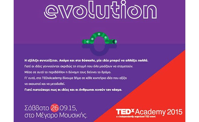 Στις 26/9 το TEDxAcademy 2015Με κεντρικό θέμα την Εξέλιξη, το φετινό TEDxAcademy θα προσπαθήσει μέσα από ένα διαδραστικό διάλογο να αναδείξει την ταχύτητα και την κατεύθυνση αυτής της εξέλιξης σε κοινωνικό, αλλά και σε ανθρώπινο επίπεδο.