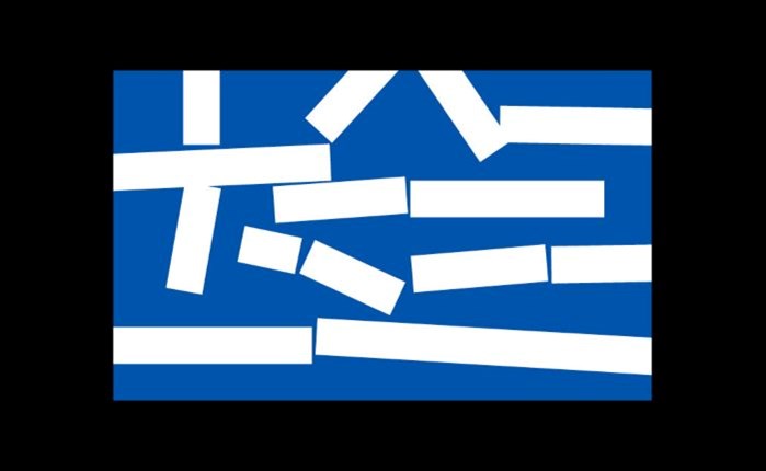 Δείχνει την ελληνική σημαία με τις λωρίδες της σπασμένες σε κομμάτια σε μια διάταξη που θυμίζει τα βαγόνια μετά το πολύνεκρο δυστύχημα από τη σύγκρουση δύο τρένων στα Τέμπη.