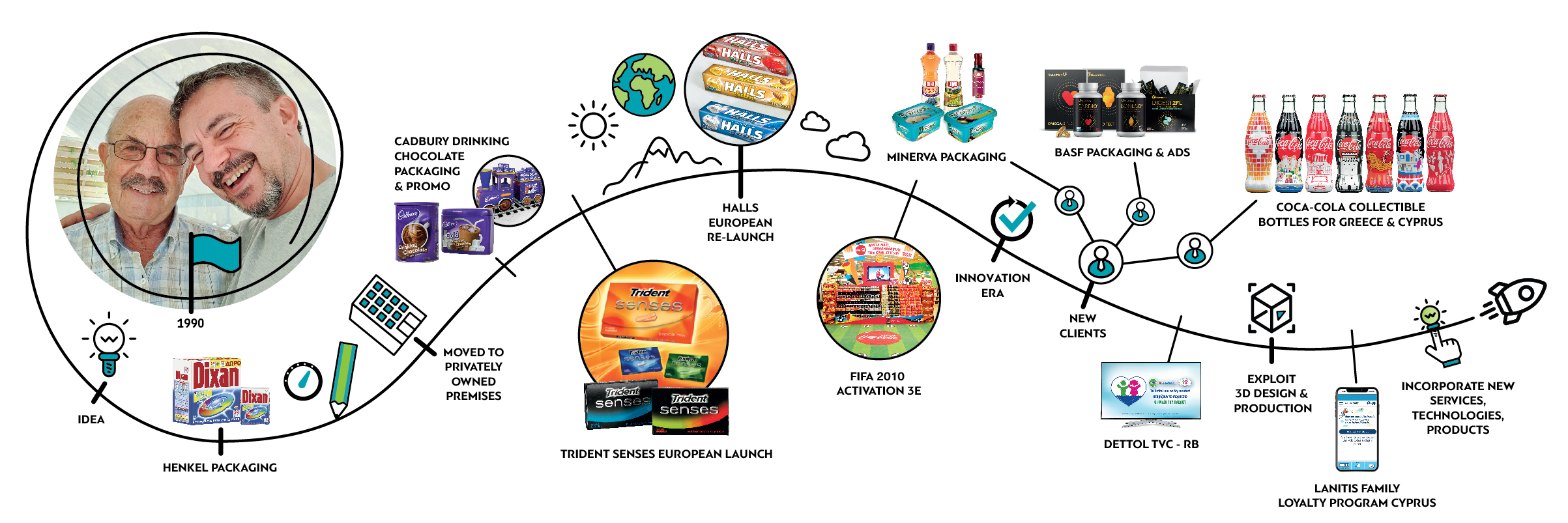 Από πού να ξεκινήσει κανείς! Οι συσκευασίες Dixan, Neomat, στα ‘90s για τη Henkel Hellas, οι συσκευασίες και BTL υλικά για Activia, Danonino της Danone Hellas, καθώς και της ΕΨΑ, τα concepts και POP υλικά που δηµιουργήσαµε για τα brands της Mondelēz και που οδήγησαν στο λανσάρισµα των Trident Senses, η ανάληψη του πανευρωπαϊκού λογαριασµού της Halls. Αξέχαστο θα µείνει και το πανελλαδικό activation µε events σε όλες τις αλυσίδες λιανικής για την Coca-Cola 3Ε στο Fifa 2010, και φυσικά οι 7 συλλεκτικές συσκευασίες για το πιο Global Brand, την Coca-Cola, καθώς και η σύλληψη, ο σχεδιασµός και η δηµιουργία της ενέργειας loyalty “Lanitis Family” τον προηγούµενο χρόνο.