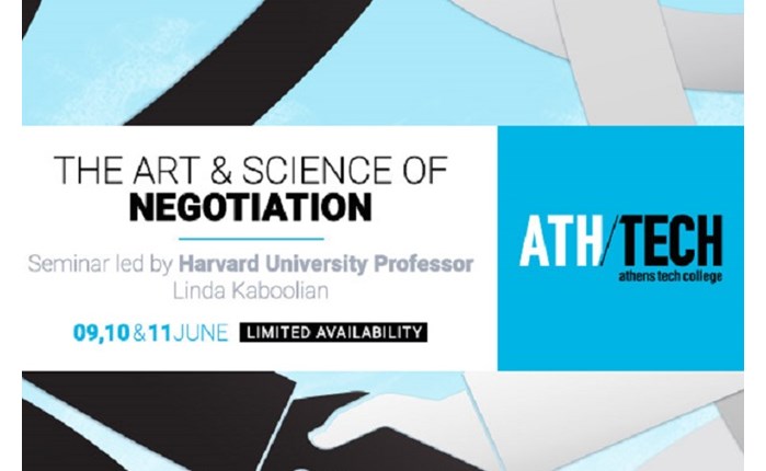 Το Athens Tech College, το πρώτο κολλέγιο τεχνολογίας, διοργανώνει ένα τριήμερο σεμινάριο διαπραγματεύσεων από 9-11 Ιουνίου στις εγκαταστάσεις του με καλεσμένη ομιλήτρια την κα Linda Kaboolian, Wertheim Fellow του Harvard Law School.