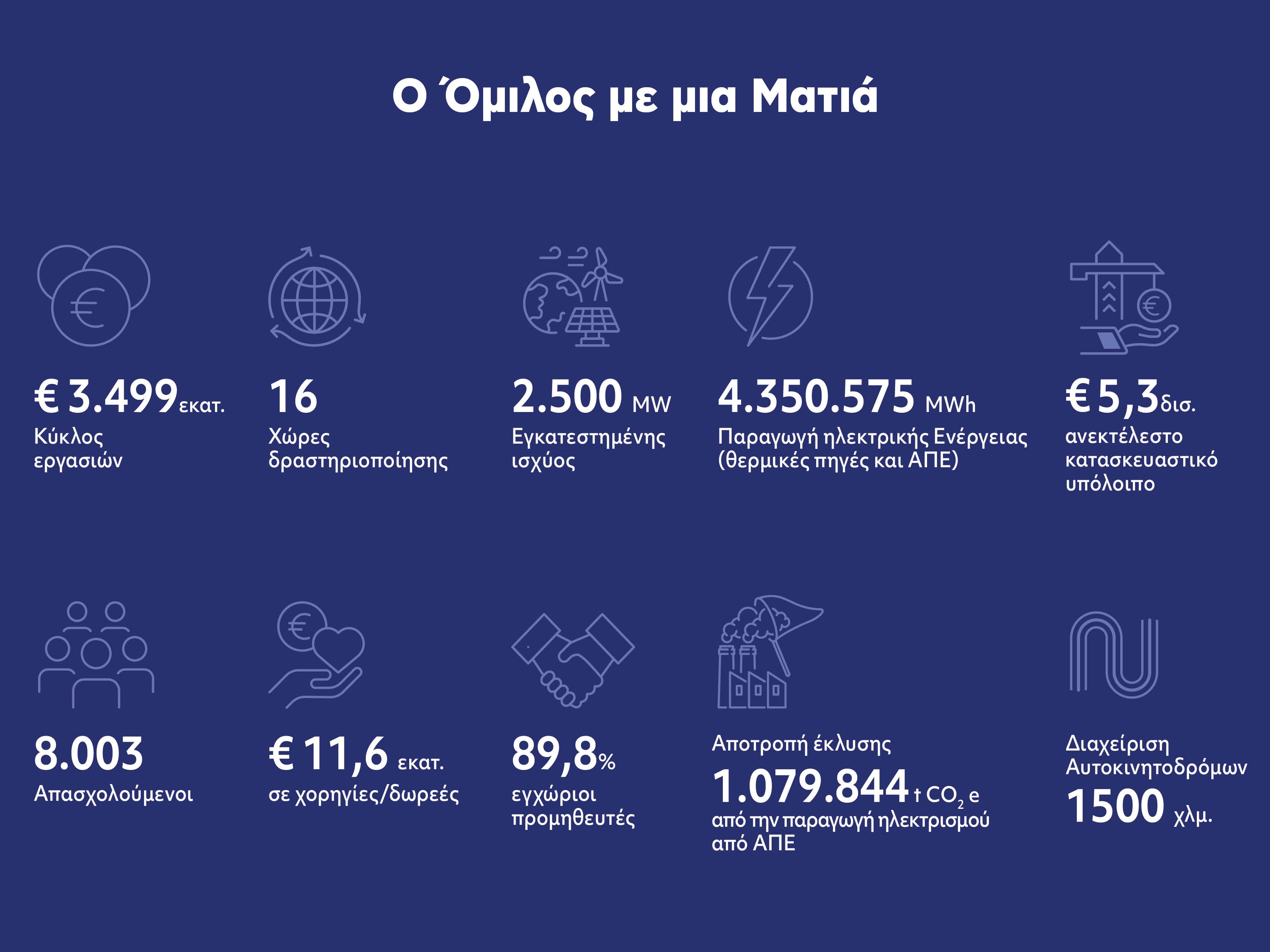 Περιβαλλοντική Διαχείριση: Οι δράσεις και επιδόσεις του Ομίλου για τη μείωση του περιβαλλοντικού του αποτυπώματος, με έμφαση στην εξοικονόμηση ενέργειας, τη διαχείριση αποβλήτων και την προστασία της βιοποικιλότητας. Συγκεκριμένα, το 2023, ο Όμιλος συμμετείχε επιτυχώς στη διεθνή πλατφόρμα Carbon Disclosure Project (CDP) και έλαβε βαθμολογία B (κλίμακα A-D), αποδεικνύοντας για ακόμη μία χρονιά το επίπεδο διαφάνειας και πληρότητας των δημοσιευμένων περιβαλλοντικών στοιχείων του, καθώς και τη σημαντική αναγνώριση της στρατηγικής του για τον μετριασμό της κλιματικής αλλαγής.