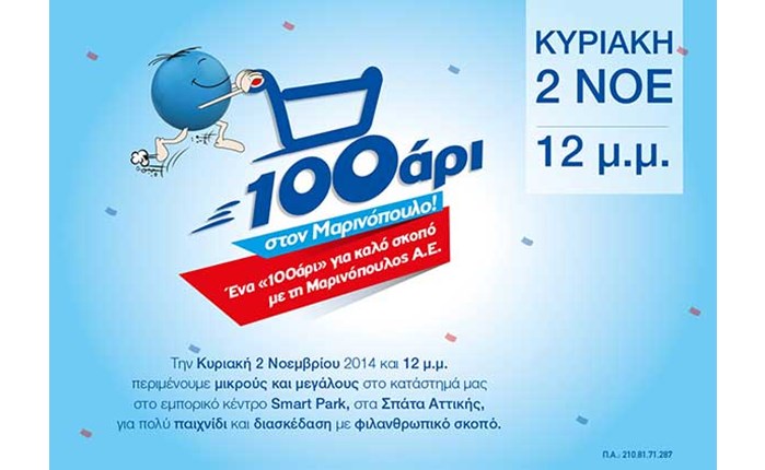 Μαρινόπουλος: 100αρι για καλό σκοπό!Με την ευκαιρία της ολοκλήρωσης της μεγάλης εμπορικής καμπάνιας της εταιρείας «100αρι στον Μαρινόπουλο», η Μαρινόπουλος Α.Ε. διοργανώνει μεγάλη εκδήλωση με φιλανθρωπικό χαρακτήρα την Κυριακή 2 Νοεμβρίου 12:00 έως τις 15:00, στο κατάστημα Carrefour στο Εμπορικό Κέντρο Smart Park.