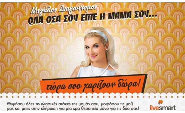 Καμπάνια της Tribal DDB για τη UnileverΗ συνέχεια της καμπάνιας, που φιλοξενείται στο www.livesmart.gr, το portal όλων των μαρκών της Unilever, είναι αφιερωμένη στη γιορτή της μητέρας, την προσεχή Κυριακή. Παράλληλα, μέσα στο www.facebook.com/LiveSmartGR, υπάρχουν... αθάνατες ατάκες όπως «ίδιος ο πατέρας σου», «θα γίνεις κι εσύ μάνα και θα δεις!», «δεν θέλω να σου πω τι να κανείς αλλά...», «θα βρεις την πόρτα κλειδωμένη». Στο πλαίσιο της καμπάνιας, πραγματοποιείται και διαγωνισμός, με δώρο ένα spa therapy για δυο άτομα.