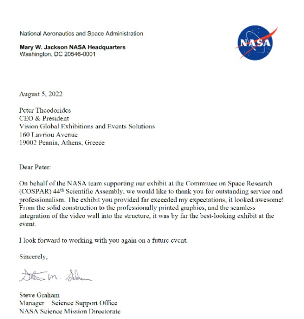 Με μία άκρως ευχαριστήρια επιστολή απευθύνθηκε η NASA στη Vision για τις υπηρεσίες που παρείχε κατά τη διάρκεια του παγκόσμιου συνεδρίου COSPAR 2022 σε συνεργασία με την AFEA Travel & Congress Services, που μας εμπιστεύτηκε σε αυτό το έργο.