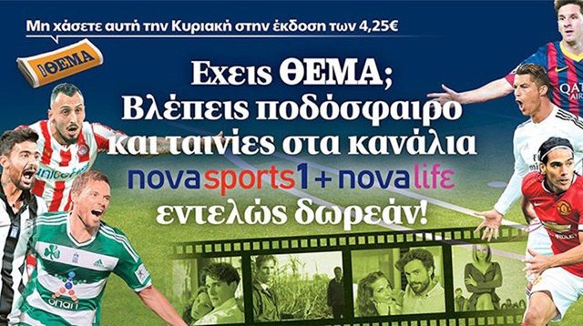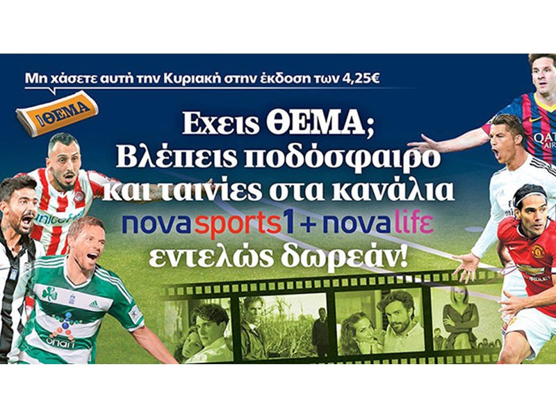 Κάθε Κυριακή στο ΘΕΜΑ, στην έκδοση με τις προσφορές (4,25 ευρώ), θα βρίσκεται μία καρτέλα. Η κάθε καρτέλα θα έχει ένα μοναδικό κωδικό ο οποίος θα ενεργοποιείται με ένα SMS που θα κοστίζει μόλις 0,09 ευρώ και οι αναγνώστες θα βλέπουν ΕΝΤΕΛΩΣ ΔΩΡΕΑΝ τα κανάλια Novasports 1 και Novalife για μία εβδομάδα, μέχρι δηλαδή την επόμενη Κυριακή που θα έχουν τη δυνατότητα να ανανεώσουν την πρόσβασή τους. Απλές οδηγίες της ενεργοποίησης θα υπάρχουν στην καρτέλα με τον κωδικό που θα βρίσκεται στο ΠΡΩΤΟ ΘΕΜΑ της Κυριακής 28 Σεπτεμβρίου.
