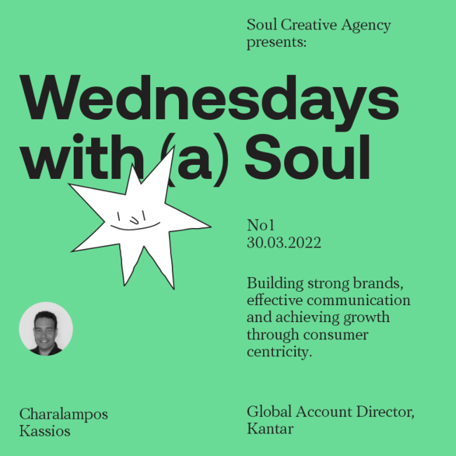 Στο πρώτο Wednesdays with (a) Soul session ο καλεσμένος θα μοιραστεί με την ομάδα της Soul Creative Agency θεματικές που αφορούν στη σημασία του branding, την ανάγκη και τις μεθόδους κατανόησης του προφίλ και της συμπεριφοράς του σύγχρονου καταναλωτή, καθώς και τα διαθέσιμα πλέον εργαλεία για τη μέτρηση της αποτελεσματικότητας της επικοινωνίας (creative effectiveness) αξιοποιώντας ακόμα και insights μέσω μεθόδων Neuroscience.