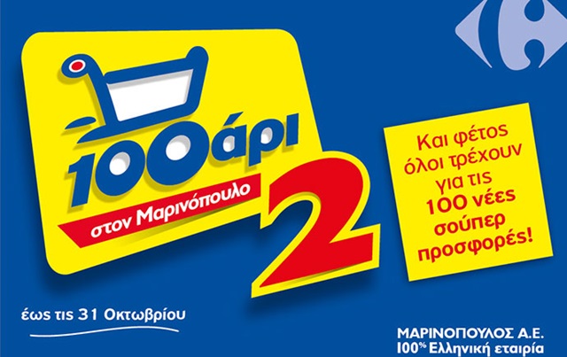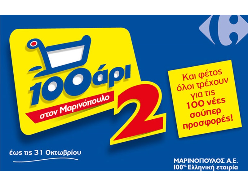 To 100αρι «τρέχει» και πάλι στον ΜαρινόπουλοΤο αγαπημένο δίδυμο της Δάφνης Λαμπρόγιαννη και του Βλαδίμηρου Κυριακίδη επανέρχεται με το 100αρι Νο2 της Μαρινόπουλος για να μας «ταξιδέψει» μέσα από 12 σπαρταριστές τηλεοπτικές ιστορίες σε 100 μοναδικές προσφορές!