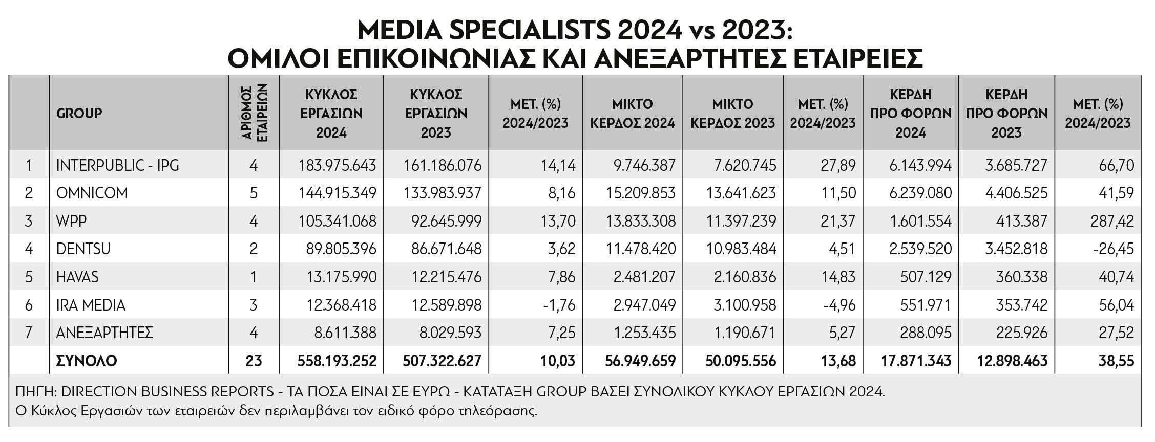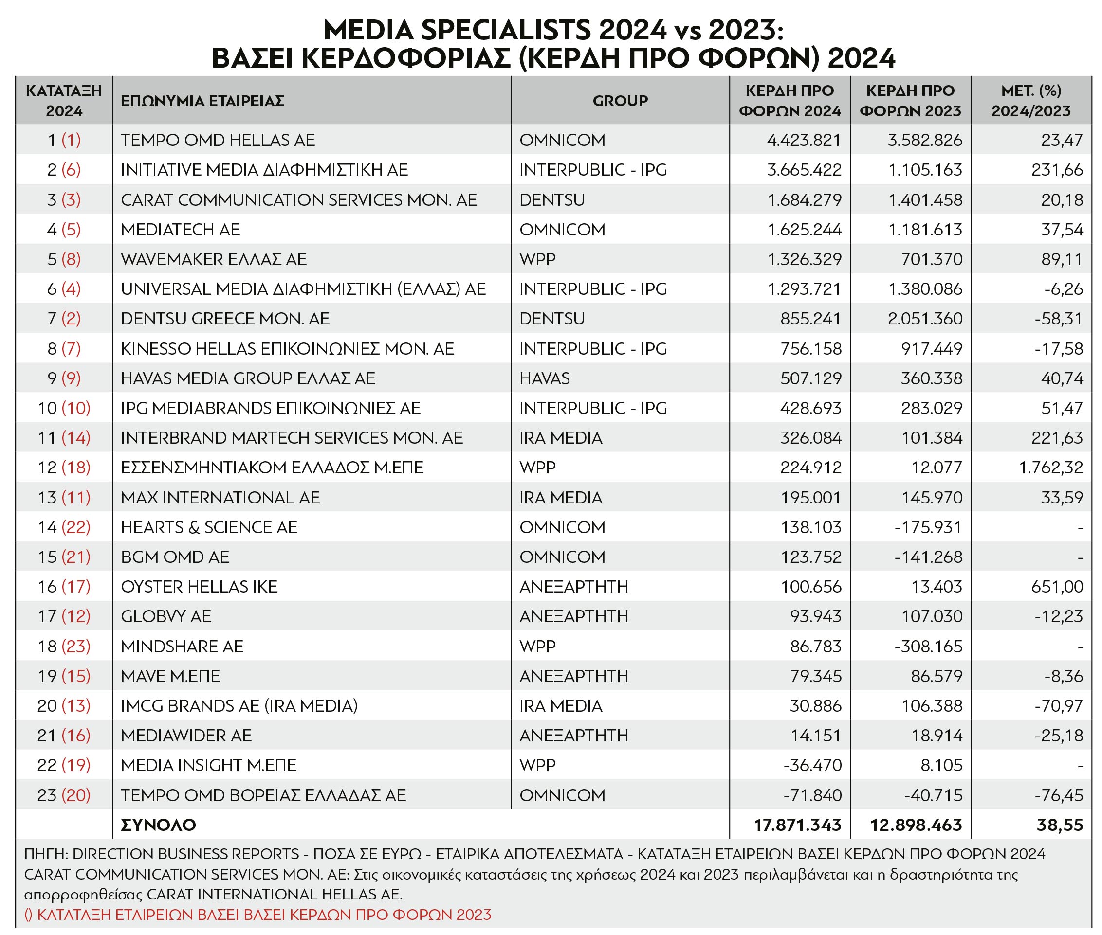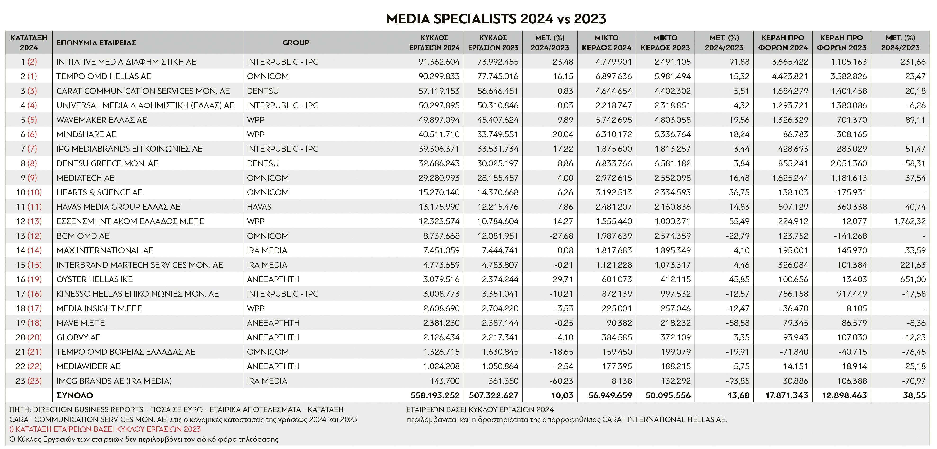 Στην κορυφή της κατάταξης βάσει κύκλου εργασιών για το 2024 βρίσκεται η Initiative Media ∆ιαφηµιστική Α.Ε. (Interpublic - IPG), µε κύκλο 91,36 εκατ. ευρώ και εντυπωσιακή άνοδο 23,48%. Τη δεύτερη θέση καταλαµβάνει η Tempo OMD Hellas AE (Omnicom), µε κύκλο 90,29 εκατ. ευρώ (+16,15%), ενώ τρίτη κατατάσσεται η Carat Communication Services Μον. Α.Ε. (Dentsu), µε 57,11 εκατ. ευρώ (+0,83%), στα οποία περιλαµβάνονται και τα έσοδα της απορροφηθείσας πλέον Carat International Hellas. Αξιοσηµείωτη είναι η παρουσία της Universal Media ∆ιαφηµιστική (Ελλάς) του IPG Group στην 4η θέση µε 50,29 εκατ. ευρώ (οριακή ή µάλλον καλύτερα ανεπαίσθητη υποχώρηση -0,03%), ενώ ακολουθούν οι Wavemaker Ελλάς (49,89 εκατ. ευρώ και ανάπτυξη +9,89%) και Mindshare A.E. (40,51 εκατ. ευρώ και ανάπτυξη +20,04%), και οι δύο µέλη του οµίλου WPP. To top 10 στην κατάταξη µε βάση τον κύκλο εργασιών συµπληρώνουν, µε σειρά εµφάνισης, οι IPG Mediabrands Eπικοινωνίες Α.Ε. (39,3 εκατ. ευρώ και ανάπτυξη 17,22%), Dentsu Greece (32,68 εκατ. ευρώ και ανάπτυξη 8,86%), Mediatech (29,28 εκατ. ευρώ και αύξηση 4%) και Hearts & Science (15,27 εκατ. ευρώ και άνοδος 6,26%). Αυτές οι δέκα εταιρείες είναι και οι µόνες που είχαν τζίρο πάνω από 15 εκατ. το 2024 ενώ µαζί µε την Havas Media Group Ελλάς A.E. και EssenseMediacom (Εσσενσµηντιακόµ Ελλάδος Α.Ε.), οι µόνες µε κύκλο εργασιών πάνω από 10 εκατ. ευρώ. Επίσης, η Τempo OMD µαζί µε την Initiative είναι οι µόνες µε τζίρο που ξεπέρασε τα 90 εκατ. ευρώ. Ακόµη, αυτές οι δύο µαζί µε την Carat Communications Services και την UM είναι οι µόνες µε τζίρο πάνω από 50 εκατ. ευρώ.