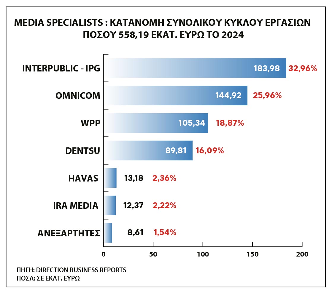 Οι τέσσερις µεγαλύτεροι πολυεθνικοί όµιλοι (Interpublic - IPG, Omnicom, WPP και Dentsu) ελέγχουν το 93,88% της αγοράς, ενώ µαζί µε τη Havas το ποσοστό αυτό ανεβαίνει στο 96,24%. Ο όµιλος Interpublic - IPG µε µερίδιο αγοράς 32,96% και πάνω από ένα στα τρία ευρώ της αγοράς να περνά µέσα από τα brands του (Initiative Media, Universal Media, IPG Mediabrands), εδραιώνει τη θέση του ως ο απόλυτος πρωταγωνιστής. Η Omnicom κατέχει το 25,96% του συνολικού κύκλου εργασιών της αγοράς, ενώ WPP και Dentsu ελέγχουν το 18,87% και το 16,09%, αντίστοιχα. Ο όµιλος Havas καταλαµβάνει µόλις 2,36%, ενώ η IRA Media βρίσκεται λίγο χαµηλότερα, στο 2,22% (12,37 εκατ. ευρώ). Οι ανεξάρτητες εταιρείες περιορίζονται σε µόλις 1,54% της αγοράς (8,61 εκατ. ευρώ), γεγονός που υπογραµµίζει τις προκλήσεις της λειτουργίας εκτός µεγάλων σχηµάτων σε ένα περιβάλλον όλο και πιο ανταγωνιστικό και απαιτητικό. Αξίζει να σηµειωθεί πως ενόψει του επικείµενου µεγάλου παγκόσµιου deal µεταξύ Omnicom και ΙPG, το νέο group που πρόκειται να δηµιουργηθεί στην Ελλάδα, µε βάση τα σηµερινά µεγέθη, θα έχει συνολικό κύκλο εργασιών που θα ξεπερνά τα 328 εκατ. ευρώ και θα διατηρεί το 58,92% της αγοράς.