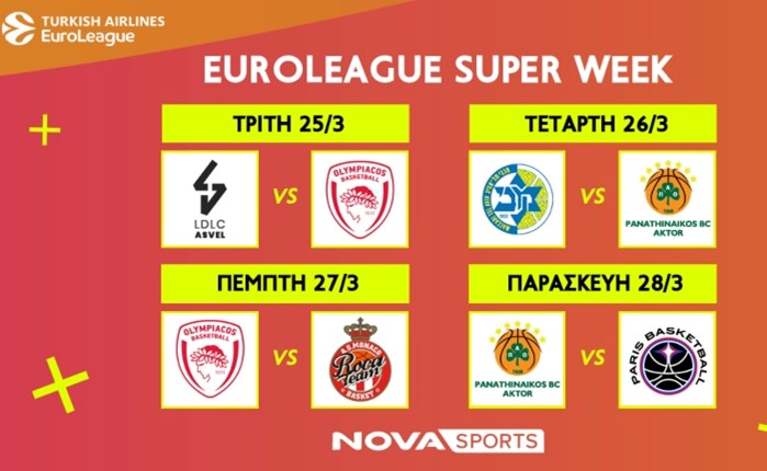 H «Διαβολοβδομάδα» Νο8 και τελευταίας της φετινής σεζόν για την EuroLeague, της κορυφαίας ευρωπαϊκής διασυλλογικής διοργάνωσης στο χώρο του μπάσκετ, με τις ελληνογαλλικές «μάχες» του Παναθηναϊκού AKTOR και του Ολυμπιακού με Βιλερμπάν, Μονακό, Παρί και την αναμέτρηση του πρωταθλητή Ευρώπης με την Μακάμπι Τελ Αβιβ έρχεται αυτή την εβδομάδα στο παρκέ του Novasports!